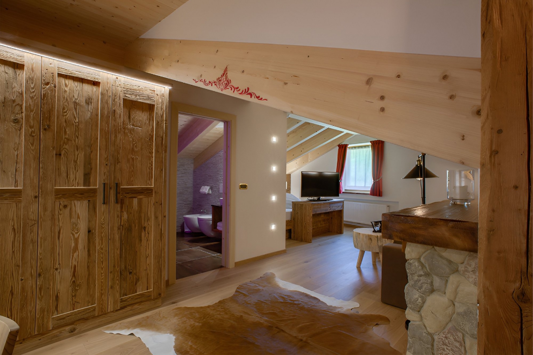 Neue, geräumige Suite mit ca. 35 m² für 2-3 Personen aus Tiroler Altholz, ausgestattet mit Doppelbett, Wohnecke mit Sofa und Kamin, edlem Badezimmer mit Dusche, Badewanne, WC, Bidet und Föhn, Safe, Telefon, Sat-TV, Minibar und Internetanschluss. (ohne Balkon) Bei Ihrer Ankunft erwartet Sie eine Flasche Prosecco bei einem Mindestaufenthalt von 3 Nächten